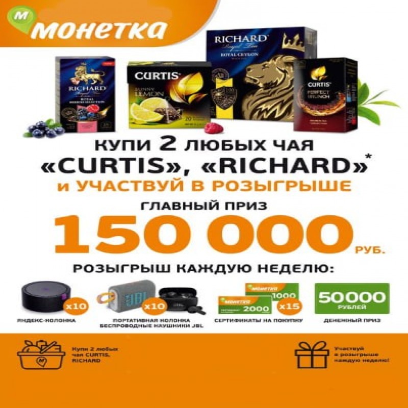 Покупай чай «CURTIS», «RICHARD» в «Монетке», регистрируй чеки и участвуй в розыгрыше 181 приза!